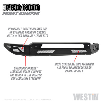 Westin Pro-Mod Front Bumper Textured Black 58-41165 Find My Store For pricing and availability $1,248.99 (Save ) Check Nearby Stores Out of stock at selected location Westins Pro-Mod Front Bumper combines enhanced vehicle protection, with great looks. Pro-Mods revolutionary lightweight modular design is uniquely engineered with outrigger reinforcement brackets to... Compare