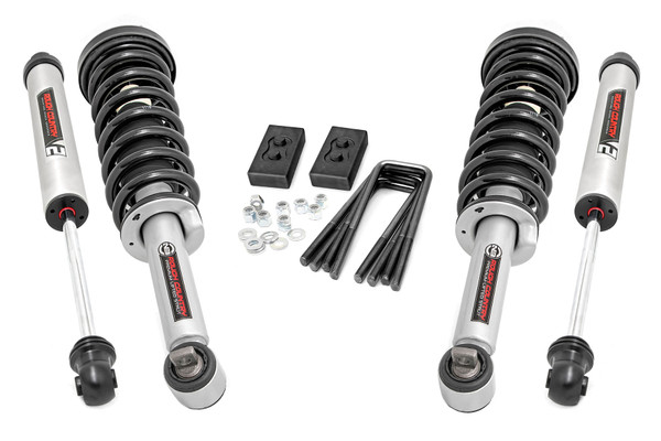 Create A New AccountLevel your F-150 with Rough Country's 2â? bolt-on leveling kit! This easy to install spacer combines great looks and strength, while providing 2 inches of lift for enough ride height to run up to 33- in. tires! Eliminate the nose-down look of your stock truck with this simple solution that raises the front end of your truck to be level with the rear! This spacer features a heavy-duty proprietary composite construction that will never rust or succumb to the elements! This kit also includes a set of rear blocks.Rough Country's spacer design eliminates all the guesswork with a specially designed driver and passenger side pattern that allows for clearance between the upper control arm and the strut. This leveling kit is easy to install, with no need to disassemble your factory strut and a 100% bolt-on installation process that can be done in no time flat using common tools in a home garage! Includes Rough Country's Lifetime Replacement Guarantee