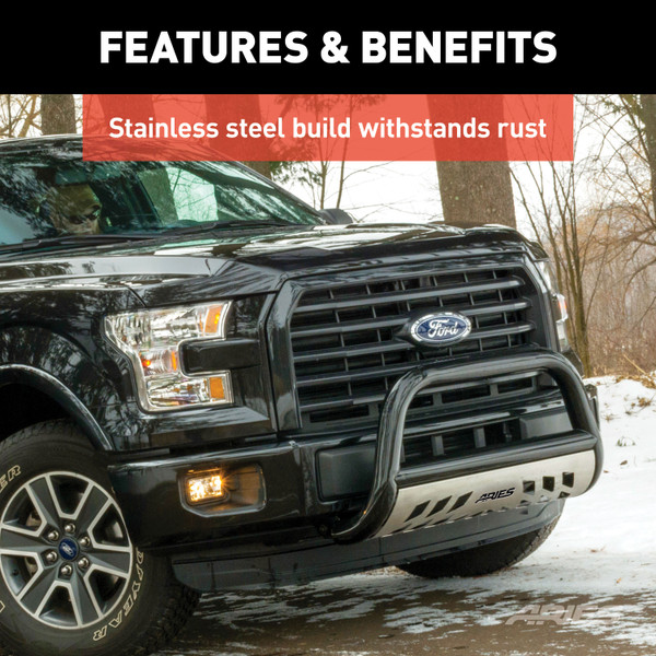 For those who brave the wasteland, it's not easy finding a bull bar that can keep up. Extreme temperatures, moisture and road salt are all waiting to turn your front end into nothing but a pile of rust. For such individuals, the ARIES 3 Stealth bull bar was designed, finished and tested to outlast harsh climates. Unlike most bull bars that come with a black finish, the Stealth bull bar is made with stainless steel instead of carbon steel. A stainless steel construction maintains reliable strength and offers the high rust resistance needed to keep going season after season. To add even more protection against elements, the Stealth bull bar is shielded in a high-gloss black powder coat. This polyester-based finish gives the stainless steel frame a thick skin to further resist rust and changing temperatures. We also put our Stealth bull bars through a rigorous salt spray test to prove this front end accessory can endure whatever the wilderness has in store. With its high resilience to salt and extreme temperatures, the Stealth bull bar provides a reliable black finish option, as an alternative to the polished stainless steel look. All Stealth bull bars are made vehicle-specific for a no-drill, custom fit, and they come with a removable brushed 304 stainless steel skid plate to protect against rocks and other small road debris. ARIES Stealth bull bars also come with two pre-drilled holes in the crossbar to accept round lights up to 5-1/2 in diameter or an LED light bar. It might not be an easy life in the wasteland, but why should that limit your choice of truck accessories? For the black finish option your truck deserves and the quality you expect, choose the ARIES 3 Stealth bull bar. This bull bar fits select model years of the Chevrolet Silverado 2500 HD or 3500 HD and GMC Sierra 2500 HD or 3500 HD (see application info to verify fitment).