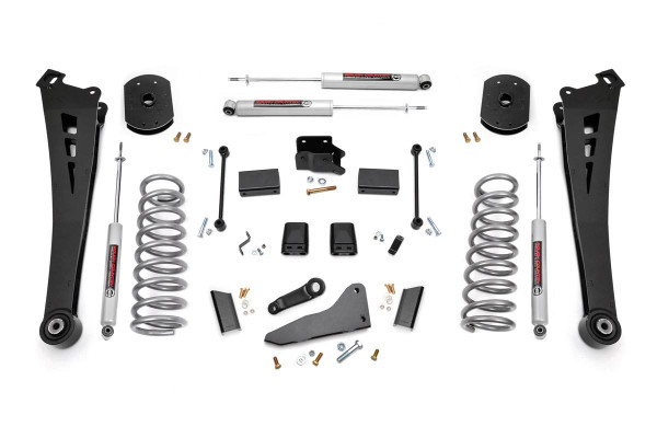 Compliment your Power Wagons aggressive, good looks with Rough Countrys new 4.5- in. Lift Kit with lifted coil springs. RAM Power WagonTrucks come with a wealth of impressive features right from the factory. Rough Countrys 4.5- in. kit was engineered to retain these impressive factory specs while bumping up performance and durability where its needed most. The result is a lifted beast with a mean profile and lush ride-quality thatll make other RAM owners wonder where you got yours from!When changing a vehicles suspension the key to preserving ride quality is in keeping the geometry of all suspension components as close to their factory angles as possible. Rough Countrys 4.5- in. Suspension kit features a set of ultra-durable Radius Arms, precision fit to bolt right into the factory mounts for an easier install and a more factory-like angle. These beefy, upgraded Radius Arms also feature a durable, Clevite Rubber Bushing for maximum vibration absorption. This kit also includes a set of front, lifted coil springs for unparalleled ride quality from your lifted Dodge Ram. This kit also includes Rough Countrys N3 Shock Absorbers. These 10-stage variable valving, high-pressure Nitrogen charged shocks offer a fantastic blend of off-road action and smooth highway ride quality. Each kit includes Rough Countrys Lifetime Replacement Guarantee!