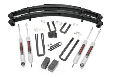 Give your 77-79 Ford Super Duty an impressive upgrade, front to back with Rough Countrys 4 in. Ford Suspension Lift Kit! This easy-to-install lift kit raises increases your ground clearance to avoid any obstacles and provides a better-than-stock look that gives an improved ride height and more aggressive appearance. This kit features a set of front, lifted leaf springs allowing you gain additional ride height without sacrificing ride quality or performance. A raised steering block and all necessary hardware is provided to keep everything at optimum angles for a factory-like ride, even after lifting. A set of Rough Countrys premium N3 shocks are also included. These fine tuned 10-stage variable high-pressure Nitrogen charged shocks offer a fantastic blend of off-road action and smooth highway ride quality. With a durable 18mm spring-loaded piston rod and faster-cooling 54mm shock body. Rough Countrys 4 in. Ford Suspension Lift Kit comes with everything you need to fit up to a 35 in. tire with proper wheel backspacing. Best of all, Rough Countrys 4' Ford Suspension Lift Kit is backed by our Lifetime Replacement Warranty.