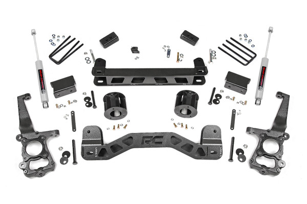 Give your 2015+ 2wd Ford F-150 an aggressive new look and unparalleled off-road performance with Rough Countrys 4- in. Suspension Lift. This all-inclusive kit features everything needed to take your 2wd F-150 off the freeway and into the fields.Featuring a set of durable lifted knuckles and strut spacers, youll gain enough ride height to run up to 33- in. tires with proper wheel spacing! A set of sway-bar drop brackets, brake line brackets, and a drive shaft spacer help keep everything at optimum angles for a factory-like ride, even after lifting. A 1/4- in. thick plate steel front and rear crossmember bring uncompromised strength and good looks to your truck, and are updated to fit the new F-150 design.A set of Rough Countrys premium shock absorbers - N3 - are also included in this kit, featuring a large diameter body with a chrome-hardened piston rod and long-lasting polyurethane bushings.Best of all, Rough Countrys 2015 Ford F-150 Lift Kit is backed by our Lifetime Replacement Warranty.