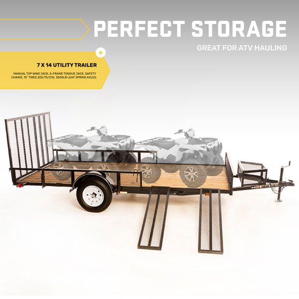 Deck Dimensions: 7' wide x 14' long — perfect for hauling side-by-sides, zero-turn mowers, compact equipment, or landscape materials