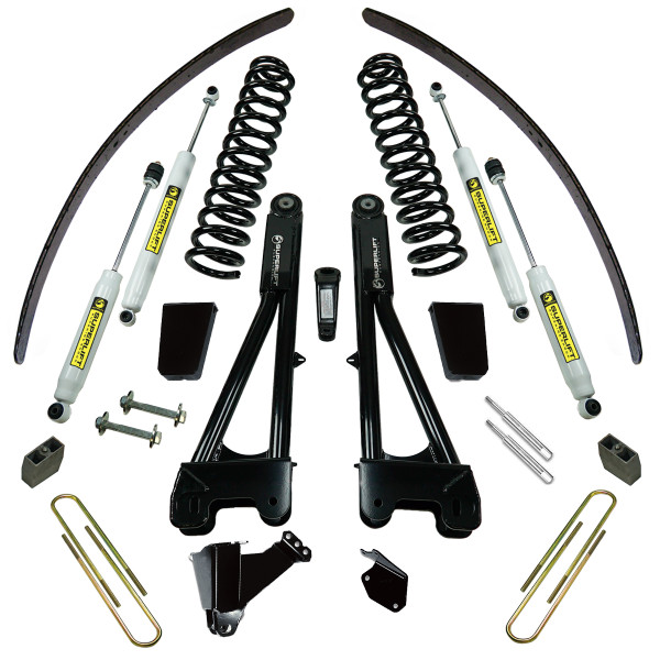 Includes: Front coil springs, track bar bracket, replacement radius arms, drop pitman arm, sway bar correction, shocks, rear block, add-a-leaf, and u-bolt kit, and all hardware required