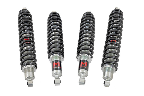 Improved Stance, Balance, and Handling. If you want to improve your Can-Am Defender's on-road performance and off-road capabilities, Rough Country's M1 Coilovers are the way to go. Our M1 Coilovers help stabilize your vehicle's movements, enhancing control when you turn, brake, accelerate or ride over uneven surfaces. As an adjustable ride height shock, these M1's keep your suspension from overextending, providing a more consistent ride. Made for rugged off-road performance, our M1 monotube shocks have a 46mm digressive piston for a more stable ride, preserving the smooth ride quality you need. Quality Construction. Rough Country's M1 Coilovers have been engineered to give you the most reliable performance, increased driving comfort, and all-around performance for your UTV. Made from 2" seamless extruded tubing and feature durable vulcanized natural rubber bushings. They're also zinc plated for resistance against the elements. Plus, they're adjustable in height. Utilizing multiple grooves in the shock body the spring perch can be raised or lowered to achieve additional height or simply function as a stock height replacement. So whether you're looking to add a little extra clearance for off-roading or just want your ride to sit a little higher, our M1 Coilovers are the perfect solution. Installation and Warranty. This bolt-on installation requires just basic tools and about 2-3 hours to complete. Our M1 Coilover Kit is backed with a three year replacement warranty towards manufacturer defects. As such, the product is protected from structural and workmanship damage after the date of purchase. With our industry-leading warranty, give yourself peace of mind when using Rough Country's products!