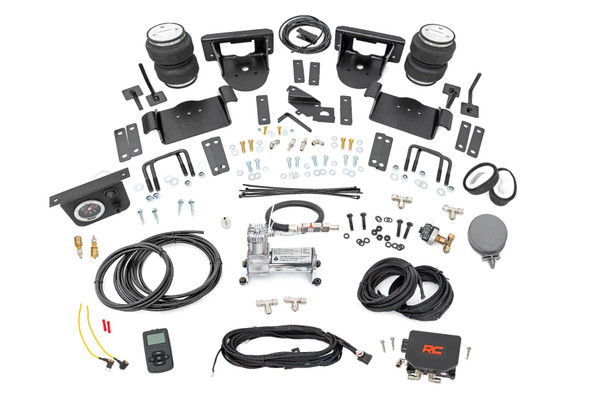 Ideal Leveling. Is your truck your workhorse? The main attraction to the pick-up line is the accessibility to haul and tow as desired. However, due to the amount of weight in the bed, or the condition of the vehicles rear leaf springs, this can cause the vehicle to be un-level when under load. Here at Rough Country, we created an innovative new product to ensure that these are troubles of the past. Introducing, Rough Countrys Rear Air Spring Kit.Heavy-duty Construction. Rough Countrys Rear Air Spring Kit features two RC branded high-quality double convoluted airbags complemented with DOT-approved airlines. Whether you plan on towing or hauling in the not-so-distant future Rough Countrys Air Spring kit is the must-have accessory to ensure that your trailer is level reducing the weight off of the tongue of your trailer. Each kit offers 1/4 in. push connector fittings and all of the bracketry needed to ensure installation is lightning fast and secure! Rough Countrys Air Spring kit provides up to 5,000 lbs of load support to ensure that you experience less sway and bottoming out when braking and steering! Installation. With an estimated timeframe of 1-2 hours this full kit can be installed at home using standard tools and can be completed efficiently and quickly! Limited Lifetime Replacement Warranty. Rough Countrys Rear Air Spring Kit is backed with a limited-lifetime replacement warranty towards manufacturer defects. As such, the product is protected from structural and workmanship damage after the date of purchase. With our industry-leading warranty give yourself peace of mind when using Rough Countrys Suspension products!