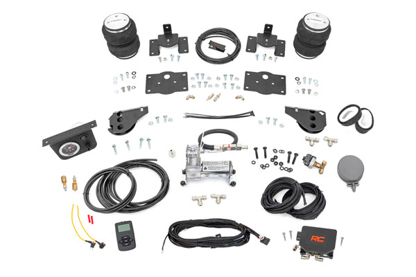 Ideal Leveling. Is your truck your workhorse? The main attraction to the pick-up line is the accessibility to haul and tow as desired. However, due to the amount of weight in the bed, or the condition of the vehicles rear leaf springs, this can cause the vehicle to be un-level when under load. Here at Rough Country, we created an innovative new product to ensure that these are troubles of the past. Introducing, Rough Countrys Rear Air Spring Kit.Heavy-duty Construction. Rough Countrys Rear Air Spring Kit features two RC branded high-quality double convoluted airbags complemented with DOT-approved airlines. Whether you plan on towing or hauling in the not-so-distant future Rough Countrys Air Spring kit is the must-have accessory to ensure that your trailer is level reducing the weight off of the tongue of your trailer. Each kit offers 1/4 in. push connector fittings and all of the bracketry needed to ensure installation is lightning fast and secure! Rough Countrys Air Spring kit provides up to 5,000 lbs of load support to ensure that you experience less sway and bottoming out when braking and steering! Installation. With an estimated timeframe of 1-2 hours this full kit can be installed at home using standard tools and can be completed efficiently and quickly! Limited Lifetime Replacement Warranty. Rough Countrys Rear Air Spring Kit is backed with a limited-lifetime replacement warranty towards manufacturer defects. As such, the product is protected from structural and workmanship damage after the date of purchase. With our industry-leading warranty give yourself peace of mind when using Rough Countrys Suspension products!