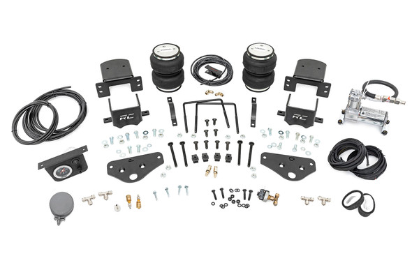 Ideal Leveling. Is your truck your workhorse? The main attraction to the pick-up line is the accessibility to haul and tow as desired. However, due to the amount of weight in the bed, or the condition of the vehicles rear leaf springs, this can cause the vehicle to be un-level when under load. Here at Rough Country, we created an innovative new product to ensure that these are troubles of the past. Introducing, Rough Countrys Rear Air Spring Kit. Heavy-duty Construction. Rough Countrys Rear Air Spring Kit features two RC branded high-quality double convoluted airbags complemented with DOT-approved airlines. Whether you plan on towing or hauling in the not-so-distant future Rough Countrys Air Spring kit is the must-have accessory to ensure that your trailer is level reducing the weight off of the tongue of your trailer. Each kit offers 1/4 in. push connector fittings and all of the bracketry needed to ensure installation is lightning fast and secure! Rough Countrys Air Spring kit provides up to 5,000 lbs. of load support to ensure that you experience less sway and bottoming out when braking and steering! Installation. With an estimated timeframe of 1-2 hours this full kit can be installed at home using standard tools and can be completed efficiently and quickly! Limited Lifetime Replacement Warranty. Rough Countrys Rear Air Spring Kit is backed with a limited lifetime replacement warranty towards manufacturer defects. As such, the product is protected from structural and workmanship damage after the date of purchase. With our industry-leading warranty give yourself peace of mind when using Rough Countrys Suspension products!