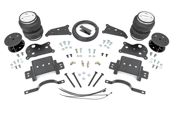 Ideal Leveling. Is your truck your workhorse? The main attraction to the pick-up line is the accessibility to haul and tow as desired. However, due to the amount of weight in the bed, or the condition of the vehicles rear leaf springs, this can cause the vehicle to be un-level when under load. Here at Rough Country, we created an innovative new product to ensure that these are troubles of the past. Introducing, Rough Countrys Rear Air Spring Kit.Heavy-duty Construction. Rough Countrys Rear Air Spring Kit features two RC branded high-quality double convoluted airbags complemented with DOT-approved airlines. Whether you plan on towing or hauling in the not-so-distant future Rough Countrys Air Spring kit is the must-have accessory to ensure that your trailer is level reducing the weight off of the tongue of your trailer. Each kit offers 1/4 in. push connector fittings and all of the bracketry needed to ensure installation is lightning fast and secure! Rough Countrys Air Spring kit provides up to 5,000 lbs of load support to ensure that you experience less sway and bottoming out when braking and steering! Installation. With an estimated timeframe of 1-2 hours this full kit can be installed at home using standard tools and can be completed efficiently and quickly! Limited Lifetime Replacement Warranty. Rough Countrys Rear Air Spring Kit is backed with a limited-lifetime replacement warranty towards manufacturer defects. As such, the product is protected from structural and workmanship damage after the date of purchase. With our industry-leading warranty give yourself peace of mind when using Rough Countrys Suspension products!