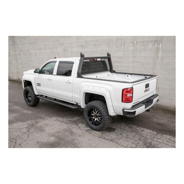 There are a lot of trucks out there, and setting yourself apart means going outside the lines, thinking outside the box and living life on the edge. The ARIES AdvantEDGE headache rack offers a unique look and extra protection for your pickup truck. It is distinguished by two key features: an eight-sided tube profile and an all-aluminum construction. Armed with a rock-solid mounting system, an octagonal grid center section and two finish options, the AdvantEDGE headache rack has your back. The all-aluminum construction allows it to protect your truck cab and easily resist the elements. Unlike the more common round and square tube frames of most headache racks, it is built with an octagonal tube profile. This not only supplies it with strength but also offers a look that better complements the style of modern pickup trucks. Because it is made entirely from aluminum, the AdvantEDGE headache rack is also very lightweight and completely resilient to rust. The AdvantEDGE headache rack also features a unique dual track system along the top edge. This provides a flexible mounting point for aftermarket lights, such as an LED light bar, as well as tie-down anchors and other accessories. The AdvantEDGE headache rack is available in two finish options -- carbide black powder coat or chrome powder coat -- for a custom look to complement the style of your truck. Installation is easy with its patented anchoring system. The stake pocket mounting system anchors to the walls of your truck bed with no drilling required, and it provides dependable strength and rigidity for the headache rack. This AdvantEDGE headache rack fits specific years of the Chevy Silverado 1500, 2500 HD, 2500 HD Classic, 3500 HD or 3500 Classic and GMC Sierra 1500, 2500 HD, 2500 HD Classic, 3500 HD or 3500 Classic (see application info to verify fitment). It also complements other AdvantEDGE accessories, including the AdvantEDGE bull bar and AdvantEDGE side bars.