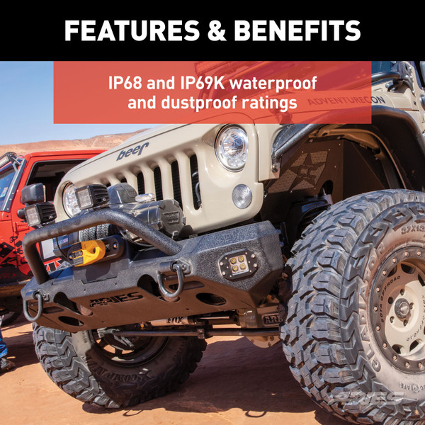ARIES LED lights are made to shine bright, last long and take a beating. Each light boasts grade-A Cree LED chips, an IP68-standard breather, waterproof aluminum construction, a 50,000+ hour lifespan and a pedigree of thorough testing and certifications. At the heart of each ARIES LED light is a set of grade-A LED chips. These chips are made by Cree, a leader in LED technology, to ensure the utmost quality and high light output. Each LED is set into a high-efficiency reflector to eliminate as much wasted light as possible and allowing for 96% reflector efficiency. This means a farther-reaching, more powerful beam without increased electrical input or higher running temperatures. The LED chips are securely mounted in a strong, rust-free aluminum housing and shielded with a rugged Lexan lens to withstand impacts and resist cracking. The housing keeps moisture out and allows us to give our LED lights an IP68 and IP69K waterproof and dustproof rating. Each light is also equipped with an IP68-standard breather that completely seals the housing and keeps moisture and air from getting inside and corroding the LEDs. ARIES LED lights are outfitted with dual, oversize heat sinks for optimal efficiency and longevity. These heat sinks keep running temperatures low, protect against burnout and promote a long operating life. Our lights average a 50,000-hour lifespan, translating to five years of continuous use. They also feature instant on-off, so no time is wasted waiting for the light to warm up. To prove that our LED lights are different, they undergo strenuous testing, including a UV test, extreme temperature test, vibration test, dust test, salt test and altitude test. They are CE-certified and RoHS-certified. Each light comes with stainless steel mounting hardware and pivoting bracket for custom positioning on your vehicle, and each is fitted with a strong, waterproof wiring harness for a reliable connection.