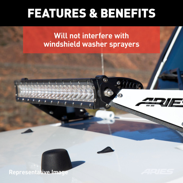 There is a sense of possibility unlike any other that comes every time you grip the wheel of your Wrangler JK and throw the transmission into drive. For shedding a little extra light on the trail and standing out from the rest of the herd, ARIES Jeep hood light mounting brackets are the accessory of choice. They mount quickly and easily on the hood of the Jeep Wrangler JK, using factory mounting points, and accept the included 20 in. single-row LED light bar #1501262. The light bar features grade-A Cree LED chips, an IP68-standard breather and provides a 9,800-lumen combo beam pattern. Because the brackets use existing mounting locations, there is no drilling necessary, and they will not interfere with the factory windshield washer sprayers. To easily outlast rust and keep your Jeep JK looking like a pro, these LED light bar mounting brackets are made from stainless steel and are shielded in a carbide black powder coat finish.