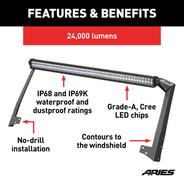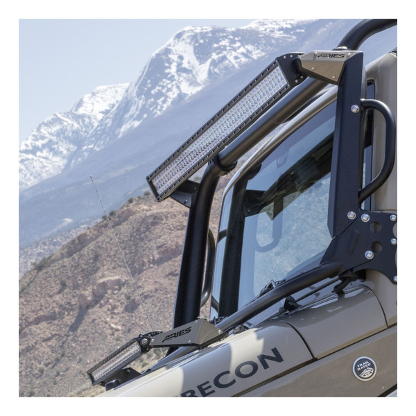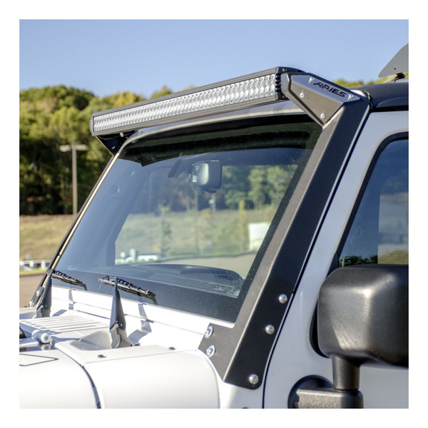 ARIES Jeep roof light mounting brackets allow you to mount a 50 in. LED light bar above your windshield, lighting the way on the trail and making your Jeep Wrangler stand out from the pack. These LED light bar mounting brackets feature stainless steel construction with a durable powder coat finish to provide maximum rust resistance and easily outlast the elements. They also feature removable stainless steel cover plates that allow for easier access to the light bar mounting hardware during installation. With the cover plates bolted into place, the light bar hardware is protected and hidden from view for added security and a more integrated look. ARIES Jeep light brackets are fast and easy to install, using factory mounting points on the Jeep JK to eliminate the need for drilling. Once installed, the roof light brackets accept the included ARIES 50 in. double-row LED light bar #1501278. The light bar is built with grade-A Cree LED chips, an IP68-standard breather and provides a 24,000-lumen, combo beam pattern. These roof light mounting brackets can also be purchased with an included center crossbar that spans the width of the windshield and provides a mounting point for multiple smaller light bars or work lights (see part #15914).