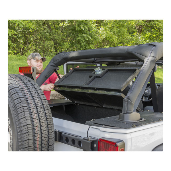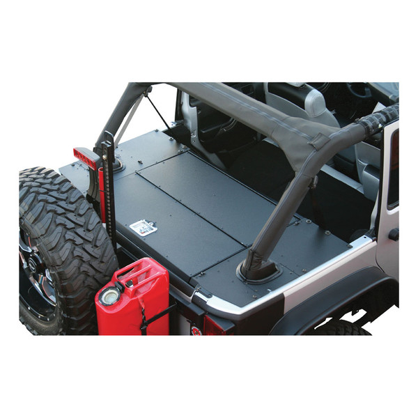 The ARIES Jeep security cargo lid is the perfect line of defense for your items, whether youre out on the trail or just putting in another day at the office. This six-panel, aluminum enclosure works with the layout of the Jeep JK 4-door to turn the rear compartment into a large, fully lockable storage area. The simple, six-panel design bolts directly into the bed of the Jeep Wrangler, utilizing the existing space and layout. This allows for a convenient storage area that works independently of the rear door and is compatible with the hardtop off or on, as well as with a soft top or subwoofer. It features a key-operated, quarter-turn latch for quick, convenient access to the cargo area. Simply insert the key, turn the latch and lift the lid. The locking latch mechanism is made with durable metal components and is covered in a chrome finish for lasting rust resistance. Tie-down anchors and a weight capacity of 75 lbs. allow additional items to be stored on top of the Jeep security cargo lid. The tie-down anchors have a 1/2 in. diameter to accept various cargo straps or bungees. The lid can also be flipped up and converted into a usable surface, such as a table or workbench. Part of building the ultimate off-roading machine is keeping your Jeep agile and lightweight. The ARIES security cargo lid is made with hardened, T6 aluminum construction, making it strong, rust-free and lightweight. An aluminum construction allows the lid to keep valuables safe, while easily withstanding the elements. Each panel is also covered in a textured black powder coat finish that is specifically designed to hide scratches and grime. For a complete installation, the ARIES Jeep security cargo lid comes with all necessary hardware.