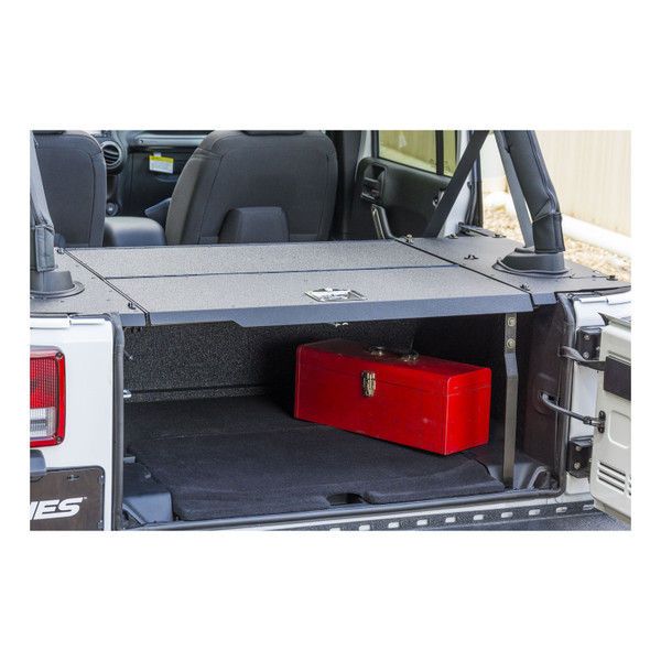 The ARIES Jeep security cargo lid is the perfect line of defense for your items, whether youre out on the trail or just putting in another day at the office. This six-panel, aluminum enclosure works with the layout of the Jeep JK 4-door to turn the rear compartment into a large, fully lockable storage area. The simple, six-panel design bolts directly into the bed of the Jeep Wrangler, utilizing the existing space and layout. This allows for a convenient storage area that works independently of the rear door and is compatible with the hardtop off or on, as well as with a soft top or subwoofer. It features a key-operated, quarter-turn latch for quick, convenient access to the cargo area. Simply insert the key, turn the latch and lift the lid. The locking latch mechanism is made with durable metal components and is covered in a chrome finish for lasting rust resistance. Tie-down anchors and a weight capacity of 75 lbs. allow additional items to be stored on top of the Jeep security cargo lid. The tie-down anchors have a 1/2 in. diameter to accept various cargo straps or bungees. The lid can also be flipped up and converted into a usable surface, such as a table or workbench. Part of building the ultimate off-roading machine is keeping your Jeep agile and lightweight. The ARIES security cargo lid is made with hardened, T6 aluminum construction, making it strong, rust-free and lightweight. An aluminum construction allows the lid to keep valuables safe, while easily withstanding the elements. Each panel is also covered in a textured black powder coat finish that is specifically designed to hide scratches and grime. For a complete installation, the ARIES Jeep security cargo lid comes with all necessary hardware.