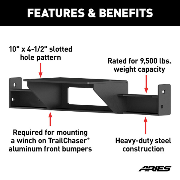 This w in. reinforcement bracket provides the added strength needed for mounting a w in. on the ARIES TrailChaser front aluminum bumper for Jeep Wrangler JK. It is constructed from high-strength carbon steel and rated to a weight capacity of 9,500 lbs. It also features standard, slotted mounting holes to be compatible with most w inches, and it comes with a durable black powder coat finish for lasting protection against the elements.