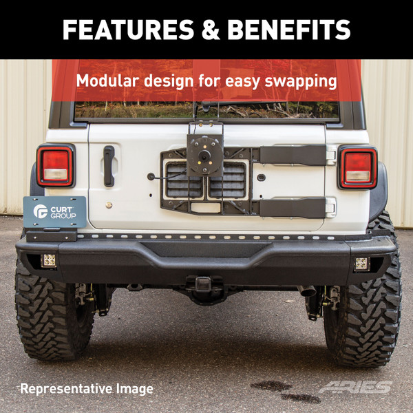 The ARIES TrailChaser Jeep bumper is unlike any other bumper for the Jeep Wrangler JL because it features a modular design. This particular bumper for the rear of the Jeep includes the center section and side extensions. It is constructed from T6 aluminum alloy to be strong, lightweight and rust-free, and has a unique, textured black powder coat finish for maximum corrosion resistance. It is also available in high-strength, powder-coated steel. All ARIES TrailChaser bumpers install using pre-existing factory mounting points for fast, easy installation with no drilling required.