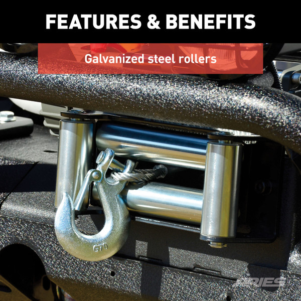 For functionality on the trail, the ARIES w in. roller fairlead allows for smooth, safe operation of a w in. on the front end of your Jeep Wrangler JK. It is equipped with a set of galvanized steel rollers to guide the w in. cable as it is drawn in, keeping it from damaging the w in. and other surrounding components. This roller fairlead is compatible with most w inches, featuring industry-standard mounting holes and a strong steel body. It features a highly durable carbide powder coat finish to outlast the elements and can be used on both ARIES TrailCrusher bumpers and TrailChaser bumpers (w in. adapter plate #2072100 or w in. fairlead mount #15600FB required for installation on TrailChaser).