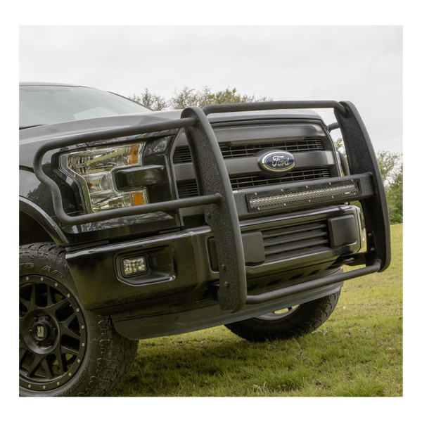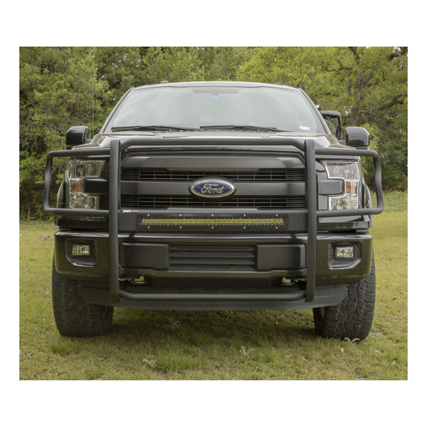 The ARIES Pro Series grille guard is unlike any other grille guard or brush guard on the road today because of its patented center crossbar. Other than the fact that it features a solid one-piece build, a tough powder coat finish and a vehicle-specific design, the ARIES Pro Series grille guard has a unique center crossbar that houses an LED light bar, allowing you to truly set your truck apart from all others. Rather than using a set of light clips or forcing you to drill holes into the frame, the aerodynamic crossbar of the Pro Series grille guard is the light bar housing itself. It uses a 30 in. slotted channel bracket to mount the included 30 in. LED light bar #1501264. The bracket can also accept other single-row light bars (some 30 in. light bars may not fit). The crossbar mount can also articulate, allowing you to position the light beam at any angle you prefer. Integrating the channel mount into the crossbar housing also keeps the light bar protected from the elements. To further stylize your truck, the Pro Series grille guard also comes with an interchangeable grille guard cover plate. Included with each grille guard is a black mesh cover plate that easily bolts on and provides added security for your aftermarket lights. The mesh cover plate can be swapped out with other cover plate options, including five different styles and two finishes. Solid construction should be an essential feature of any grille guard, and the Pro Series grille guard is more than qualified. It has a one-piece design of 1/4 in. thick welded plates and 1-1/2 in. mandrel-bent carbon steel tubing. We also finish each Pro Series grille guard in a highly durable, dual-layer E-coat and textured black powder coat, giving it resilience to rust and scratches. This unique finish also helps hide minor scratches and grime to maintain a clean look. ARIES Pro Series grille guards are made vehicle-specific for seamless integration with the factory bumper and an easy, no-drill installation.