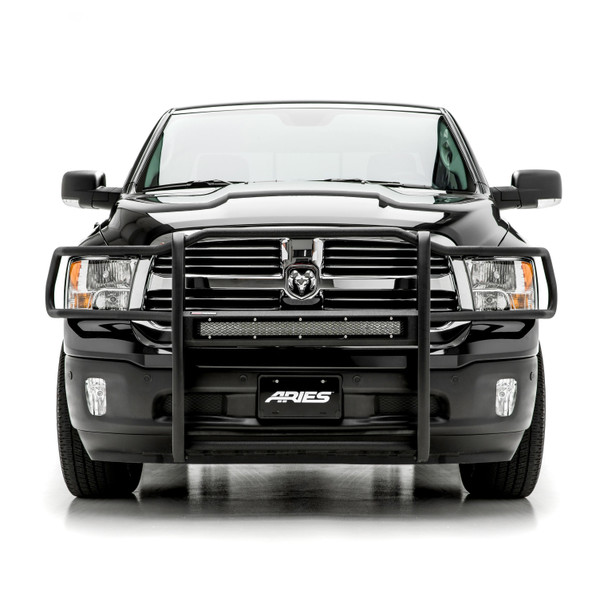 The ARIES Pro Series grille guard is unlike any other grille guard or brush guard on the road today because of its patented center crossbar. Other than the fact that it features a solid one-piece build, a tough powder coat finish and a vehicle-specific design, the ARIES Pro Series grille guard has a unique center crossbar that houses an LED light bar, allowing you to truly set your truck apart from all others. Rather than using a set of light clips or forcing you to drill holes into the frame, the aerodynamic crossbar of the Pro Series grille guard is the light bar housing itself. It uses a 30 in. slotted channel bracket to mount the included 30 in. LED light bar #1501264. The bracket can also accept other single-row light bars (some 30 in. light bars may not fit). The crossbar mount can also articulate, allowing you to position the light beam at any angle you prefer. Integrating the channel mount into the crossbar housing also keeps the light bar protected from the elements. To further stylize your truck, the Pro Series grille guard also comes with an interchangeable grille guard cover plate. Included with each grille guard is a black mesh cover plate that easily bolts on and provides added security for your aftermarket lights. The mesh cover plate can be swapped out with other cover plate options, including five different styles and two finishes. Solid construction should be an essential feature of any grille guard, and the Pro Series grille guard is more than qualified. It has a one-piece design of 1/4 in. thick welded plates and 1-1/2 in. mandrel-bent carbon steel tubing. We also finish each Pro Series grille guard in a highly durable, dual-layer E-coat and textured black powder coat, giving it resilience to rust and scratches. This unique finish also helps hide minor scratches and grime to maintain a clean look. ARIES Pro Series grille guards are made vehicle-specific for seamless integration with the factory bumper and an easy, no-drill installation.