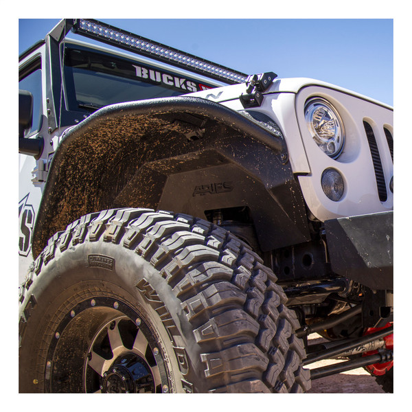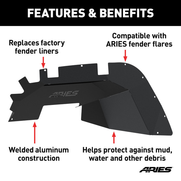 For those who eat, sleep and breathe off-roading, ARIES fender flares show off your off-road tires better than factory flares, and they feature strong, lightweight aluminum construction to easily stand up to the elements. These front and rear inner fender liners are designed to mount with ARIES Jeep JL fender flares and provide ultimate protection for your engine compartment against mud, water and road debris. ARIES Jeep inner fender liners are constructed from welded aluminum to not only be lightweight and rust-free, but also to offer better strength than the plastic factory fender liners. They are also covered in a highly durable carbide black powder coat finish for maximum corrosion protection. ARIES fender liners install securely in conjunction with ARIES fender flares and include all necessary hardware for a complete installation (some drilling and rivet nut installation required). Jeep fender liners are also available in individual sets for the front or rear.