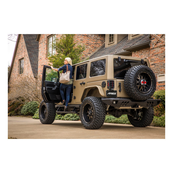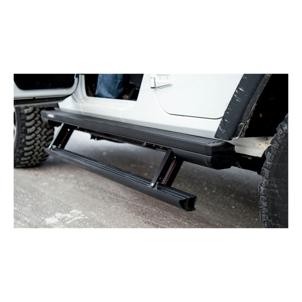 ARIES ActionTrac powered running boards are unique from other power side steps because they are actually two steps in one. This patented step-within-a-step design -- combined with a no-drill bracket installation, control module operation and powder-coated aluminum construction -- truly makes these retractable running boards an asset for the offroad truck or Jeep Wrangler, particularly as lifted truck steps. ActionTrac powered running boards have one 4 in. wide step on top of the main housing and one 3 in. wide that automatically deploys as needed. When the door opens, the control module deploys the power step 8 in. below the main step, 15 in. below the doorsill, depending on the model. This two-step design offers enhanced safety and easier vehicle entry and exit, especially on large, lifted vehicles. Its also very helpful for families with young children and for elderly passengers. The design also allows for a contoured look on the vehicle and offers extra protection for the rocker panels from small stones and other debris. For additional safety, the module is able to detect any obstructions during operation to avoid p in. hazards and damage to the power steps. LED lights are also built into the housing to illuminate the steps when deployed. ARIES ActionTrac powered running boards are made for vehicle-specific installation for a custom fit. They use pre-existing factory holes for the brackets to eliminate drilling. They also do not require any splicing into factory wiring. Each set of retractable running boards is constructed from powder-coated 6061-T6 aluminum to be strong, lightweight and non-corrosive. The quiet, maintenance-free rotary motor is shielded within the main housing, along with the power step pivot points and all electrical components, protecting them from the harsh elements and promoting long life. NOTE: Mounting brackets for these running boards are not included and must be purchased separately or as part of a kit.
