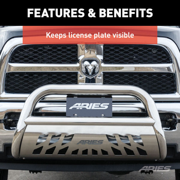 From the cattle rancher on the open range to the industrial man of the asphalt jungle to the jerky-jawing trail hog of the north woods, ARIES bull bars are made for those who face the uncertain road without fear. They feature a vehicle-specific design for a custom fit, easy customization options and durable construction to complement the look of your truck or SUV. This license plate relocation bracket allows you to reposition your license plate after installing an ARIES 3 in. bull bar. It mounts directly onto the center crossbar, using existing hardware, and keeps your license plate secure and clearly visible. The bracket is constructed from strong carbon steel and features a durable black powder coat finish for long-lasting protection against the elements.