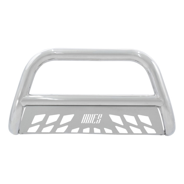 From the cattle rancher on the open range to the industrial man of the asphalt jungle to the jerky-jawing trail hog of the north woods, the ARIES 3 in. bull bar is made for those who face the uncertain road without fear. This particular model is constructed from 304 stainless steel. 304 stainless is high in nickel content, allowing the bull bar to easily resist water, road salt and rust and maintain its mirror-like polished finish in spite of the elements. Other available finishes include high-gloss black stainless steel, textured black steel and semi-gloss black steel. Customizing the look of your vehicle is simple with the ARIES 3 in. bull bar. It is equipped with pre-drilled light mounting holes and a removable skid plate. The center crossbar features two pre-drilled holes that readily accept an LED light bar or two LED work lights. The skid plate is made from 304 stainless steel and has a brushed finish to stop rust and hide scratches and scuffs. It also features an aggressive, ARIES-exclusive cutout pattern and can be removed for a customized look. Each ARIES 3 in. bull bar is made a vehicle-specific design, meaning that for each make and model, the bull bar has a custom bend and unique mounting brackets. This allows for the best possible fit on your vehicle and ensures solid attachment. The brackets also use pre-existing factory holes in the vehicles frame to eliminate drilling, speed up installation and increase rigidity. For a different breed of bull bar, ARIES has what youre looking for.
