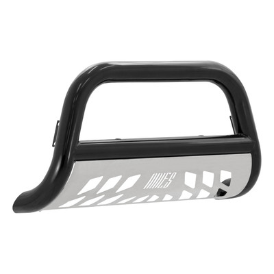 For those who brave the wasteland, its not easy finding a bull bar that can keep up. Extreme temperatures, moisture and road salt are all waiting to turn your front end into nothing but a pile of rust. For such individuals, the ARIES 3 in. Stealth bull bar was designed, finished and tested to outlast harsh climates. Unlike most bull bars that come with a black finish, the Stealth bull bar is made with stainless steel instead of carbon steel. A stainless steel construction maintains reliable strength and offers the high rust resistance needed to keep going season after season. To add even more protection against elements, the Stealth bull bar is shielded in a high-gloss black powder coat. This polyester-based finish gives the stainless steel frame a thick skin to further resist rust and changing temperatures. We also put our Stealth bull bars through a rigorous salt spray test -- the most rigorous in the industry -- to prove this front end accessory can endure whatever the wilderness has in store. With its high resilience to salt and extreme temperatures, the Stealth bull bar provides a reliable black finish option, as an alternative to the polished stainless steel look. All Stealth bull bars are made vehicle-specific for a no-drill, custom fit, and they come with a removable brushed 304 stainless steel skid plate to protect against rocks and other small road debris. Like our other 3 in. bull bars, ARIES Stealth bull bars also come with two pre-drilled holes in the crossbar to accept round lights up to 5-1/2 in. in diameter or an LED light bar. It might not be an easy life in the wasteland, but why should that limit your choice of truck accessories? For the black finish option your truck deserves and the quality you expect, choose the ARIES 3 in. Stealth bull bar.