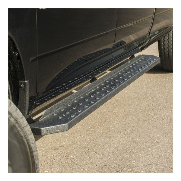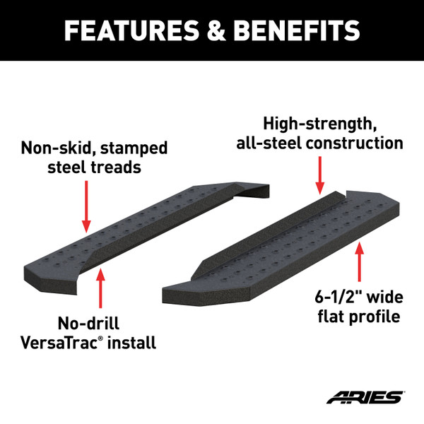 Powerful, definitive and uncompromising as a mountain ridge, ARIES RidgeStep running boards are made for the truck owner who gets it done, day after day. With their solid, all-steel construction, non-skid treads and tough powder coat finish, RidgeStep running boards are made to finish the job. Installation of these running boards is easy and secure because they use the ARIES VersaTrac mounting system. The underside of each board is equipped with a channel that accepts a set of heavy-duty bracket inserts. The inserts move along the channel to fit your vehicle, and the mounting hardware provides a secure attachment. The boards are made in four base lengths, including 53 in., 75 in., 85 in. and 91 in., and they are designed for vehicle-specific application (NOTE: VersaTrac mounting brackets are sold separately; see the application information to determine which brackets and boards fit your vehicle). ARIES RidgeStep running boards are not only made for easier installation, but they are also built to face the harsh elements of the commercial job. They feature high-strength, solid steel construction for a step that can keep up with those steel-toe boots, and they are completely without plastic parts, meaning they will not crack or fade over time. Their stamped, all-steel tread offers a 6-1/2 in. wide, non-skid surface that will never wear down no matter how many times you climb in and out of your truck. The end caps are also made from steel and are welded to contour to the body of your vehicle for a professional finish. RidgeStep running boards come with a unique E-coat and textured black powder coat finish to not only withstand rust but also to hide minor scratches and grime. From the cattle ranch of the arid desert plains to the forgotten forest trails of the frozen tundra, the job doesnt wait for those who lag behind. Rise to the challenge and master the job with ARIES RidgeStep running boards.