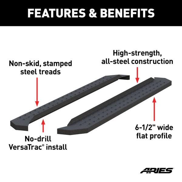 Powerful, definitive and uncompromising as a mountain ridge, ARIES RidgeStep running boards are made for the truck owner who gets it done, day after day. With their solid, all-steel construction, non-skid treads and tough powder coat finish, RidgeStep running boards are made to finish the job. Installation of these running boards is easy and secure because they use the ARIES VersaTrac mounting system. The underside of each board is equipped with a channel that accepts a set of heavy-duty bracket inserts. The inserts move along the channel to fit your vehicle, and the mounting hardware provides a secure attachment. The boards are made in four base lengths, including 53 in., 75 in., 85 in. and 91 in., and they are designed for vehicle-specific application (NOTE: VersaTrac mounting brackets are sold separately; see the application information to determine which brackets and boards fit your vehicle). ARIES RidgeStep running boards are not only made for easier installation, but they are also built to face the harsh elements of the commercial job. They feature high-strength, solid steel construction for a step that can keep up with those steel-toe boots, and they are completely without plastic parts, meaning they will not crack or fade over time. Their stamped, all-steel tread offers a 6-1/2 in. wide, non-skid surface that will never wear down no matter how many times you climb in and out of your truck. The end caps are also made from steel and are welded to contour to the body of your vehicle for a professional finish. RidgeStep running boards come with a unique E-coat and textured black powder coat finish to not only withstand rust but also to hide minor scratches and grime. From the cattle ranch of the arid desert plains to the forgotten forest trails of the frozen tundra, the job doesnt wait for those who lag behind. Rise to the challenge and master the job with ARIES RidgeStep running boards.