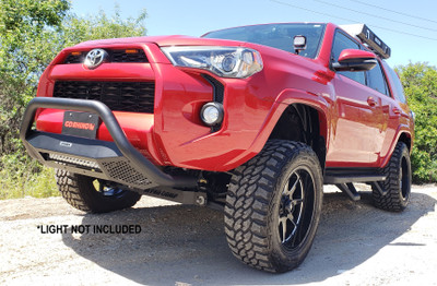 Removal of Pro4X skid plate and factory tow hooks is required. License plate relocation is required