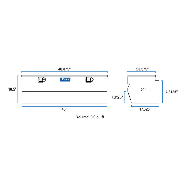 UWS wedge utility chest boxes provide unbeatable storage and security for your items in the bed of your truck and on the jobsite. Each box features a corrosion-resistant aluminum construction, a stainless steel locking system and a patented RigidCore foam-filled lid -- all to keep your equipment and valuables safe, well-organized and easily accessible whenever needed. This particular tool box features a wedged design to optimize storage space without obstructing other accessories in the truck bed, including the wheel wells. Each UWS truck tool box is constructed from extra-thick aluminum for increased structural strength. The tub is welded together into a single piece for weather resistance and to easily hold heavy tools and other items. The lid features a patented foam core, sandwiched between two aluminum plates. This core greatly increases the rigidity of the lid and helps prevent ben