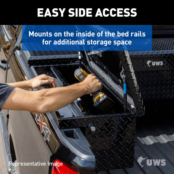 UWS truck side tool boxes provide unbeatable storage and security for your items in the bed of your truck. Each box features a corrosion-resistant aluminum construction, a highly secure stainless steel push-button locking system and a patented RigidCore foam-filled lid -- all to keep your equipment and valuables safe, well-organized and easily accessible whenever needed. Each UWS truck tool box is constructed from extra-thick aluminum for increased structural strength. The tub is welded together into a single piece for weather resistance and to easily hold heavy tools and other items. The lid features a patented RigidCore foam-filled design, sandwiched between two aluminum plates. This greatly increases the strength of the lid and helps prevent bending and warping, making operation very smooth. This particular truck tool box features a low profile for a more streamlined look and to match