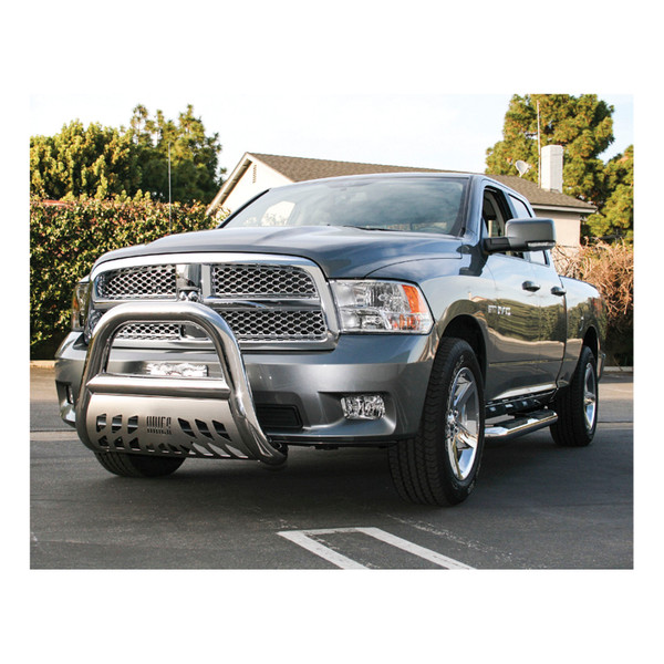 The ARIES Big Horn 4 bull bar boasts a hefty 4 diameter tube to give your truck a bold look with the toughness to back it up. It is constructed from 304 stainless steel to be strong and highly rust-resistant. 304 stainless has a greater nickel content than many other types of stainless steel, allowing it to better withstand water, road salt and rust and maintain a clean surface. It also comes with a mirror-like polished finish for a bright accent on the front end of your vehicle. This bull bar is also available in a textured black powder-coated aluminum construction to give you the freedom to customize the look of your truck. Each Big Horn bull bar offers easy customization options with its pre-drilled light mounting holes. The crossbar features two mounting points to accept an LED light bar or two LED work lights. The bull bar is also equipped with a brushed stainless steel skid plate. The skid plate is made from highly rust-resistant 304 stainless steel and protects against loose gravel and other small road debris. It comes with an aggressive ARIES-exclusive cutout and can also be removed for a customized look. Made to complement our Big Step side bars, the Big Horn bull bar is perfect for lifted trucks, diesels and full-size pickups. Not only does it provide a bold, aggressive look, but it is also made to fit your vehicle perfectly. Each one features a unique bend that accents the shape and contour of a specific front-end application. Our 4 bull bar is also equipped with vehicle-specific mounting brackets. This allows it to be installed quicker, fit better on the vehicle's frame and eliminates the need for drilling. It uses pre-existing factory holes in the frame to cut down on installation time and add rigidity. This bull bar fits select model years of the Ram 1500 and Dodge Ram 1500 (see application info to verify fitment).
