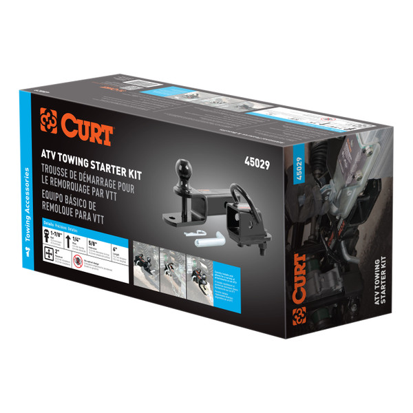 CURT ATV towing products turn your 4-wheeler adventures into more than just joyrides. The ATV towing starter kit provides you with a complete towing solution in one package. The CURT 3-in-1 ATV ball mount has multiple features, including a trailer ball for towing a small trailer, a clevis pin that accepts a tow hook or lunette ring for straight towing and a 5/8" hole for coupling a pin-style coupler. With its 2" x 2" shank, the 3-in-1 ATV ball mount lets you get more done no matter what your project may be. Likewise, the CURT bolt-on ATV adapter is a multi-functional piece of equipment that helps make the most of your ATV. The adapter simply bolts onto the ATV tongue using the included hardware and provides a 2" x 2" receiver tube opening to accept a ball mount shank or some other towing accessory. The CURT bolt-on ATV adapter has a strap ring welded right onto its frame, providing a sol