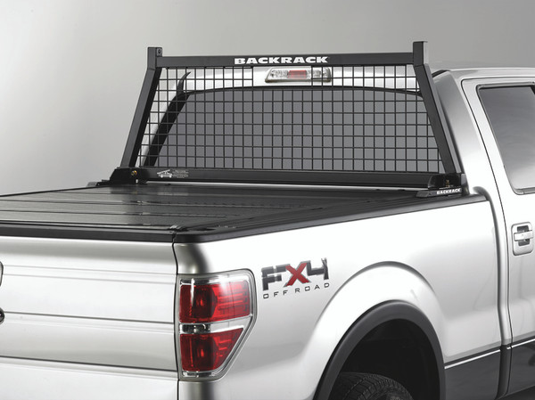 Has welded wire mesh to provide full window protection. Has wider carrying capacity above cab. Each intersection of wire is welded to avoid rattling and provide strength. Less flexibility to mount accessory light brackets than the BACKRACK(TM). Is more expensive than the BACKRACK(TM). Sits higher above the cab than the BACKRACK(TM).