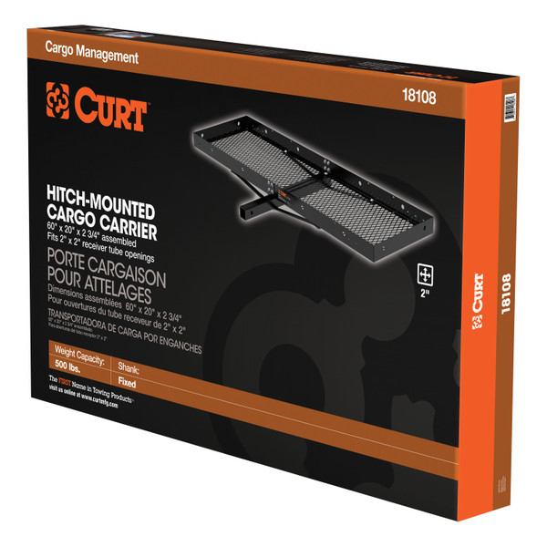 Even with the roomiest of vehicles, packing the car for a long trip can quickly turn into a frustrating game of Tetris. CURT cargo carriers are a simple yet effective solution for maximizing the storage area of your vehicle. The advantage of a hitch-mounted cargo carrier is that it can be mounted on the rear or front end of a vehicle as long as the vehicle is properly equipped with the right receiver hitch. Mounting a cargo carrier in the front opens up the rear receiver hitch for towing a trailer or adding a second carrier or bike rack if needed. The hitch-mounted design also makes installation quick and easy. CURT introduces the mesh, bolt-together, tray-style cargo carrier. This carrier features heavy-duty steel construction and a black carbide finish to resist rust and corrosion from outdoor exposure. It comes with a 2 x 2 shank and can hold up to 500 lbs. of cargo. This particular model has a fixed shank and a simple two-piece design for quick assembly. It offers a total storage area of 60 x 20.CURT tray-style cargo carriers are versatile and simple to use. They have holes along the outer edge for mounting a cargo net or bungees, making it easy to keep items secure, and they provide plenty of space to make your trip more comfortable, no matter where you are headed. Whether you prefer the hitch-mounted carrier or the roof rack option, CURT has cargo management solutions to meet your needs.