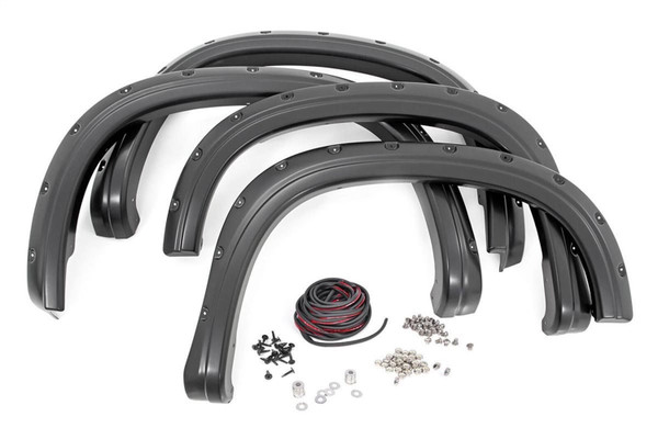 Add aggressive good looks quickly and easily with Rough Countrys Fender Flares. Nothing compliments a new lift, wheels, and tires like a set of stylish, mean-looking fender flares. Rough Countrys Fender Flares are designed with a simulated riveted look. These fender accessories bolt-on quickly and easily in a few secure mounting points, making installation a cinch. No cutting or drilling is required to install, and these flares can be easily removed and return your truck to stock! These UV treated fender flares ship in flat-black or can easily be painted to match your vehicle, and are designed to withstand the sun, rain and other elements of nature. Rough Country Fender Flares are guaranteed to be free of defects for 3 years!
