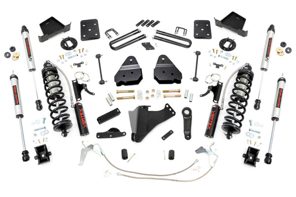Explore New Heights. Give your second-generation Ford Super Duty superior lift height with Rough Country's 4.5-inch Coilover Suspension Lift Kit! This all-inclusive kit comes with everything you need for a total transformation of your truck. Run up to 35in tires while preserving the smooth, factory ride quality with this impressive upgrade. Durable Components. When changing a vehicle's suspension, the key to preserving ride quality is keeping the geometry of all suspension components as close to their factory angles as possible. Rough Country's new 4.5-inch Suspension Lift features a set of ultra-durable radius arm drop brackets, precision fit to bolt right into the factory mounts for an easier install and a more factory-like angle. Utilizing this conversion kit you're removing the factory independent coil shock and coil set-up and replacing it with a massive 2.5in piston, nitrogen-charged, 8-stage adjustable Vertex Coilover. Rough Country's Vertex Coilovers feature a monotube design with an external reservoir for increased oil capacity and damping sensitivity. When it comes to investing in a high-end kit, you'll be pleased to find that Rough Country's 2.5in piston design is beefier and offers an impressive 56% greater fluid capacity than the average reservoir shock. Each kit is paired with a monotube shock that provides optimal damping control. Installation. Requiring cutting and drilling to install, an estimated timeframe of 6-10 hours is recommended to complete this full installation. This full kit can be installed at home and can be completed efficiently and quickly! Limited Lifetime Replacement Warranty. Rough Country's 4.5-inch Coilover Suspension Lift Kit is backed with a limited lifetime replacement warranty towards manufacturer defects. As such, the product is protected from structural and workmanship damage after the date of purchase. With our industry-leading warranty give yourself peace of mind when using Rough Country's Suspension products!
