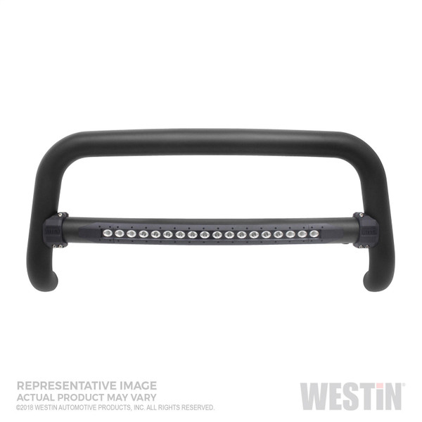 Westins Contour LED DRL Bull Bar comes equipped with an inset curved 30 combo beam single row LED light bar that includes Westins exclusive DRL (daytime running lights) with 18 x 5W Cree LEDs for higher visibility and an awesome look. Another great feature is the integrated 2 stage LED combo beam light bar: stage 1 performs for daytime time running and stage 2 gives full powered LED lighting. Adjustable center bar lets you direct the light beam slightly up or down as needed. The LED bar features a flush mount flange for a finished look. Available in textured black galvanized steel backed by a 3 year warranty.