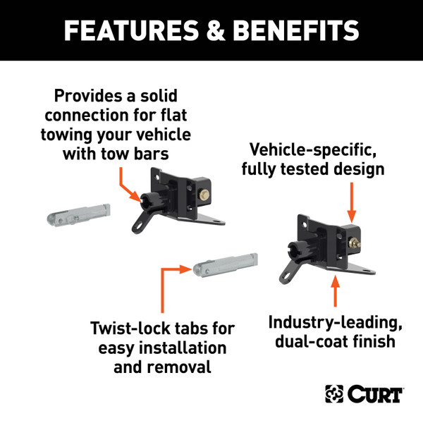 CURT tow bar base plates are engineered for a custom fit on each unique vehicle. This custom tow bar base plate fits select years of the Ford Bronco (see application info to verify fitment). It features an OE style design to fully integrate with the front of the vehicle and maintain a factory look. This Ford Bronco tow bar baseplate is constructed from high-quality steel and is precisely welded for a perfect fit. It is physically tested for absolute safety and peace of mind while dinghy towing. It also features a unique co-cured finish of liquid A-coat and highly durable powder coat to protect against the outdoor elements. This base plate for towing comes with attachment tabs, safety cables and installation hardware.