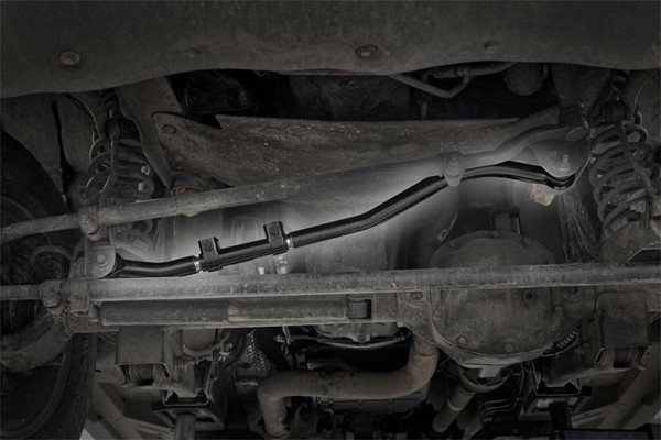 Keep your axle centered with Rough Countrys Front Forged Adjustable Track Bar. This massive 1.5in diameter track bar simply dwarfs your trucks factory equipment, offering you unparalleled support and the ultimate peace of mind in any driving situation.For those who are serious about navigating uneven terrain and pushing your RAM to the limits, Rough Countrys Forged Adjustable Track Bar is a must. This new track bar is made of forged steel and features rubber Clevite bushings for a long, durable lifespan.This fortified design allows the bar to keep your axles tame even under pure off-road torture.Best of all, its simple to install and even easier to adjust! As you lift a truck, the axles become off-centered. This new Forged Adjustable Track Bar gives you the ability to adjust and re-center the axles while mounted to the vehicle. This bolt-on product can be attached in just minutes giving you a nearly instant upgrade.While many aftermarket track bars are adjustable, Rough Countrys new bar is fully adjustable on the vehicle; meaning no removal required, no trial and error lining it up, and no more wasted time just to dial in your bar. Simply attach to the vehicle and dial in your adjustable bar using our innovative clamp and sleeve system.