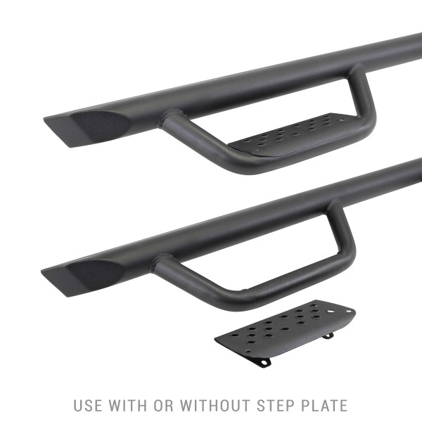 The Go Rhino Dominator D2 combines the good looks and cool factor of the drop step design with the functionality of a traditional OE oval side step. The one-piece main bar is constructed of heavy duty steel tubing with the two welded hoops strategically placed beneath each door. The punched steel step pads offer no-slip grip in wet or muddy conditions and maek entry and exiting a lifted vehicle easy. Installation is easy and the utilization of the OEM step and rock rail mount locations means no drilling or cutting required. Hardware and brackets are included. The D2 Side Steps come with a Limited Lifetime warranty on materials and construction and a 5 year warranty on the Textured Black Finish.