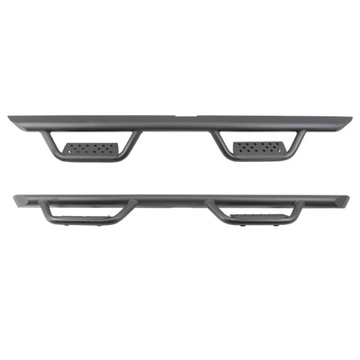 The Go Rhino Dominator Xtreme D2 combines the good looks and cool factor of the drop step design with the functionality of a traditional OE oval side step. The one-piece main bar is constructed of heavy duty steel tubing with the two welded hoops strategically placed beneath each door. The punched steel step pads offer no-slip grip in wet or muddy conditions and maek entry and exiting a lifted vehicle easy. Installation is easy and the utilization of the OEM step mount locations means no drilling or cutting required. Hardware and brackets are included. The Xtreme D2 Side Steps come with a Limited Lifetime warranty on materials and construction and a 5 year warranty on the Textured Black Finish.