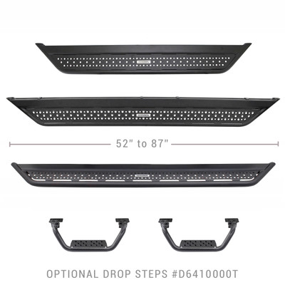 The Go Rhino Dominator D6 is a cab length body mount rock slider with a wide step area designed for the hardcore off-roader. These optional bolt-on 4” drop steps for the D6 help make entering and exiting a lifted vehicle with oversize tires much easier, especially if it is doing extra duty as family transport. Sold in pairs. The D6 Side Steps come with a Limited Lifetime warranty on materials and construction and a 5 year warranty on the Textured Black Finish.
