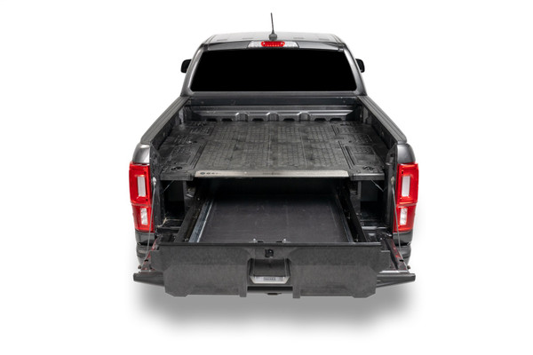 The DECKED in-vehicle storage system offers secure, weatherproof and organized storage with a sliding drawer toolbox system for pick up trucks. 100% American made, the DECKED system features two secure, full bed-length drawers capable of carrying 200lb each that glide effortlessly on industrial-grade wheels beneath a 2,000lb payload-rated deck. Constructed from rugged High Density Polyethylene (HDPE) and steel, owners get ergonomic access to tools and equipment while maintaining full use of the truck bed. DECKED systems are perfect for contractors, painters, carpenters, electricians, surveyors, plumbers, handyman services and the outdoor enthusiast who need their truck to have secure storage bins that are easy to access. The drawers slide out at waist height while still allowing the owner full use of their truck bed. The system, once assembled, is easily installed and removed. Accessories are available for customizable storage.
