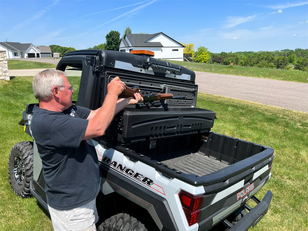 The DU-HA(R) All-Terrain is the DU-HA(R) storage device made specifically for your Polaris Ranger or Bobcat UTV. It mounts atop the UTV bed to store and protect your gear, tools, and firearms. Yes, there is a DU-HA storage device for your UTV, too! The DU-HA All-Terrain is the DU-HA answer to a dead space storage place in your Polaris Ranger or Bobcat UTV. This heavy-duty container mounts above the front of the bed in your UTV so it is easily accessible from either side, yet does not take up any floor space in your UTV bed. Keep all of your gear, tools and even your firearms in the All-Terrain. Three latches secure the top and the lid is sealed when closed to keep out moisture and dust. The All-Terrain provides a roomy 2.3 cubic feet of storage and it will easily hold two shotguns or non-scoped rifles that sit upright on the included dividers. Like all DU-HA storage devices, the All-Terrain is made of roto-molded polyethylene so it's ultra-tough and made to withstand the rigors of the outdoors.