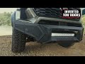 Go Rhino’s Element Front Bumper features modern styling that dramatically improves a truck’s factory appearance. It comes with a pre-installed Power Actuated Hideaway Light Bar Mount that tucks away a 20” center light bar with a flip of a switch from inside the cab. The 14 gauge 1/8” steel bumper shell is designed with lifted corners for the tire and ground clearance needed while off-roading. Attractive mesh panels help reduce weight, improve air flow, and are paintable if a customized look is desired. Dual function tow hook mounts, 1/4” steel mounting brackets and interior light pod mounts are among this loaded bumper’s features. NOTE: Some assembly and trimming may be required. Lights sold separately. Element Bumpers come with a Limited Lifetime warranty on materials and construction, a 5-year warranty on the Textured Black Finish and a 1-year warranty on the electrical compoenents.