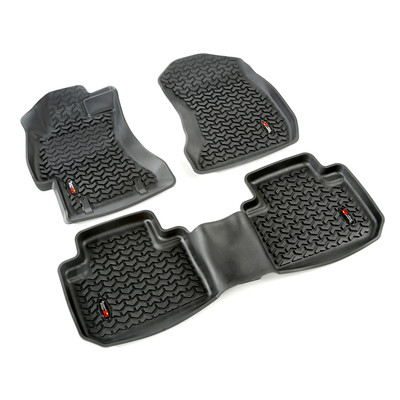 Need an affordable solution to keep the floors of your SUV looking factory fresh? This set of black front and rear floor liners from Rugged Ridge fit 14-17 Subaru Foresters. Featuring a durable OE-quality thermoplastic material that can withstand the rigor of daily abuse, each liner is perfectly contoured to your vehicle's floor for precise secure fitment (floor hook attachment where applicable). The raised lip captures all spills, water and debris keeping your interior pristine. Features a chevron shape patented deep tread technology.
